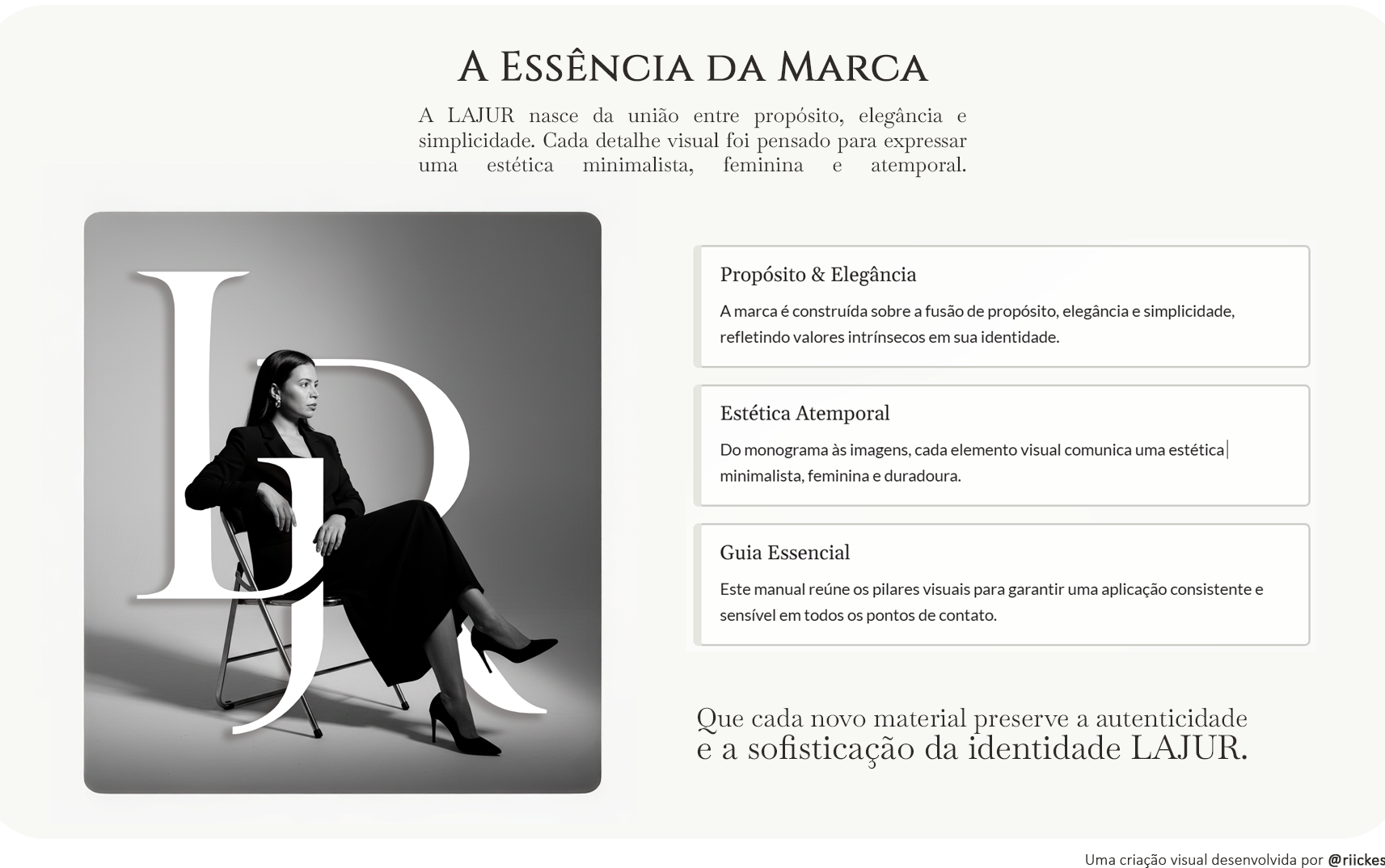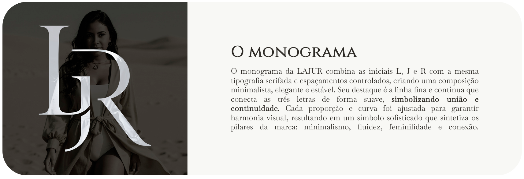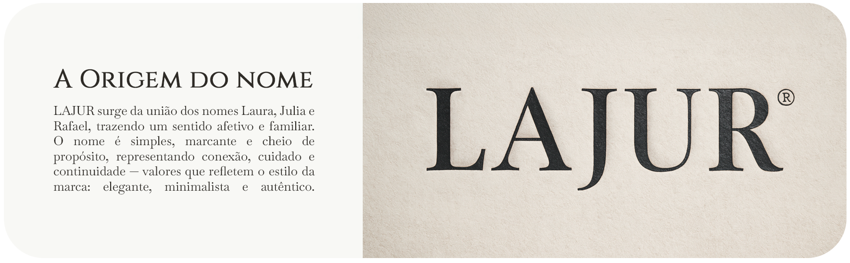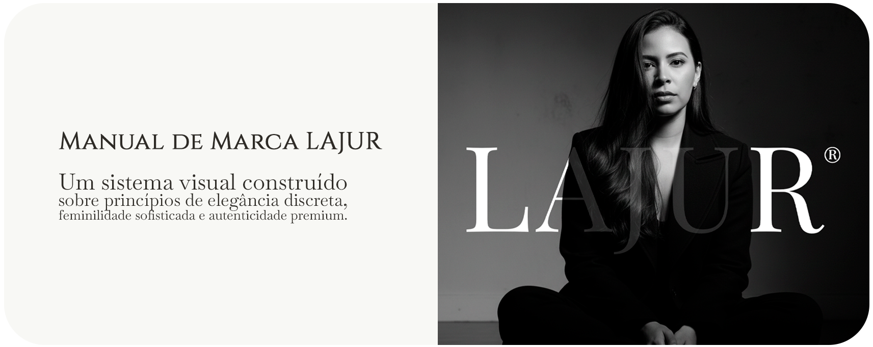 A identidade visual da LAJUR foi desenvolvida a partir da união das iniciais L, J e R, traduzindo conexão, minimalismo e autenticidade. O projeto inclui monograma, sistema tipográfico, paleta, aplicações e um hero layout que reforça a estética elegante e discreta da marca.
